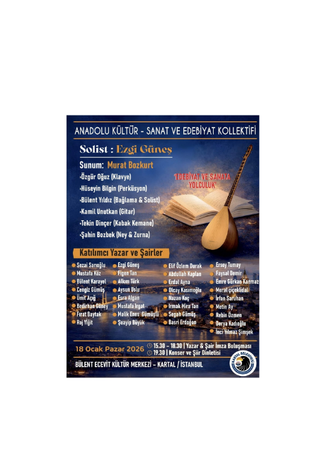 Anadolu Kültür–Sanat ve Edebiyat Kolektifi, şair ve yazarları Kartal’da buluşturuyor. Kartallıların yakından tanıdığı ve takip ettiği şair ve yazarlar Kartal’da Bülent Ecevit Kültür Merkezi’nde kitaplarıyla, şiirleriyle; Solistler Ezgi Güneş ve Bülent Yıldız ezgileri ile bugün, soğuk kış gününü sıcak bir güne dönüştürcekler.