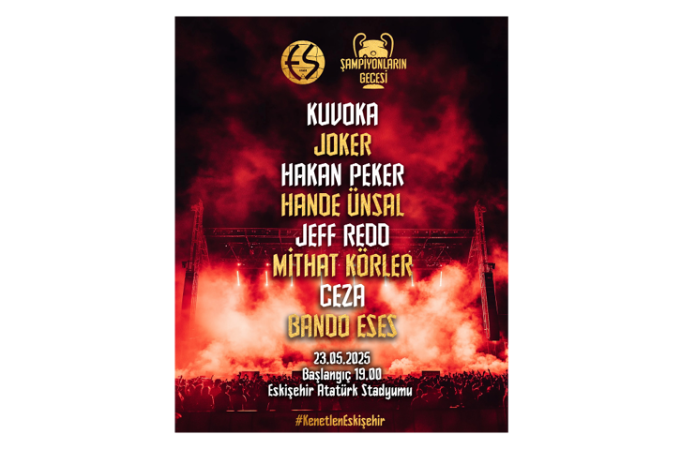 2024–2025 sezonunu şampiyonlukla tamamlayan Eskişehirspor, uzun yıllardır süren şampiyonluk özlemini “Şampiyonların Gecesi” ile taçlandırmaya hazırlanıyor. 23 Mayıs 2025 Cuma günü Eskişehir Atatürk Stadyumu’nda gerçekleştirilecek bu dev organizasyon, büyük bir coşkuya sahne olacak. Eskişehir Valiliği, Eskişehir Büyükşehir Belediyesi, Odunpazarı Belediyesi, Tepebaşı Belediyesi ve Sivrihisar Belediyesi’nin katkılarıyla düzenlenen etkinlikte 8 farklı sanatçı sahne alacak.