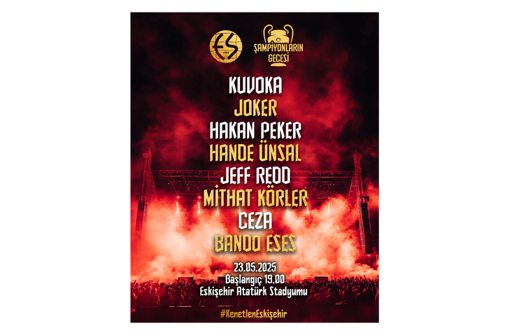 Eskişehirspor’un tarihine altın harflerle yazılan bu başarıyı tüm şehirle birlikte kutlamak, aynı zamanda kulübün yeniden yapılanma sürecine moral ve maddi katkı sunmak amacıyla organize edilen etkinlik, farklı müzik türlerinden sekiz ünlü sanatçı sahne alacak. DJ performansıyla Kuvoka, Türk rap müziğinin öncülerinden Ceza ve Joker, R&B sanatçısı Jeff Redd, Eskişehir’in sevilen sesi Mithat Körler, pop müziğin güçlü yorumcuları Hande Ünsal ve Hakan Peker ile Eskişehirspor’un marşlarını yorumlayan Bando ESES, geceye unutulmaz anlar katacak.