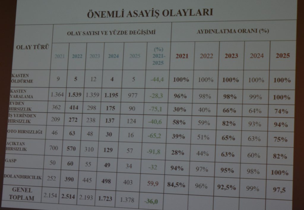 Dallı, kişilere karşı işlenen suçlar 2021’e kıyasla yaklaşık yüzde 30 azalırken, bu suçların aydınlatma oranı yüzde 99’un üzerine çıktı. Mal varlığına karşı işlenen suçlarda ise yüzde 58’in üzerinde düşüş sağlanırken, aydınlatma oranı yüzde 93 seviyelerine ulaştığını söyledi.