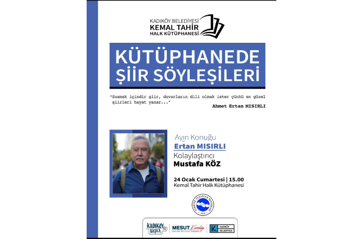 “Şiir susmak içindir; çünkü kimi zaman duvarların dili olmak gerekir. En güzel şiirleri hayat yazar.” şairi Ertan Mısırlı “Kütüphanede Şiir Söyleşileri”nin konuğu alacak.