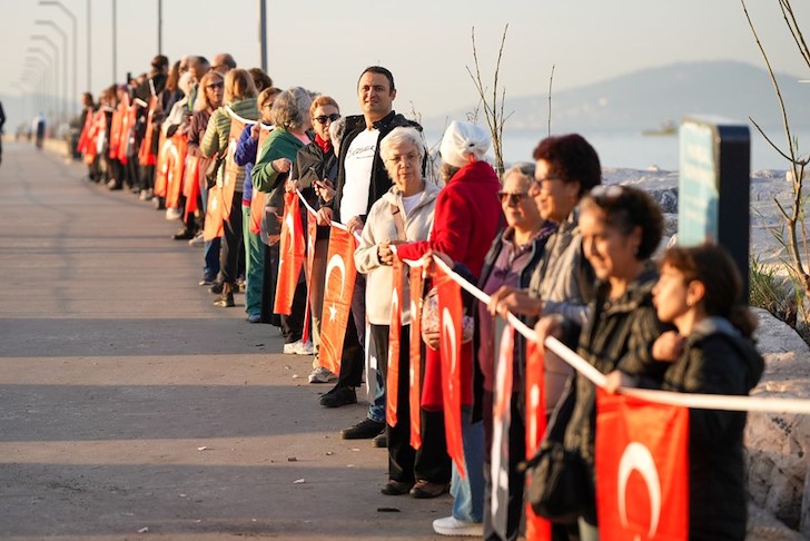 Sabahın erken saatlerinden itibaren Küçükyalı sahiline akın eden vatandaşlar, ellerinde Türk bayrakları ve Atatürk posterleriyle Küçükyalı’dan Bostancı’ya uzanan dev bir insan zinciri oluşturdu. Saat 09.05’te sirenlerin çalmasıyla birlikte tüm sahil sessizliğe büründü; binlerce kişi saygı duruşunda bulundu ve hep bir ağızdan İstiklal Marşı’nı okudu.